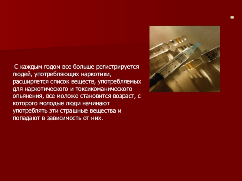 Слайд 2 С каждым годом все больше регистрируется людей, употребляющих наркотики, расширяется