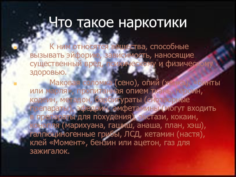 Маковая соломка (сено), опий (ханка), «бинты или марля», пропитанная опием ткань, героин, кодеин, метадон, барбитураты (снотворные препараты), эфедрин, амфетамины (могут входить в препараты для похудения), экстази, кокаин, конопля (марихуана, гашиш, анаша, план, хэш), галлюциногенные грибы, ЛСД, кетамин (настя), клей «Момент», бензин или ацетон, газ для зажигалок.