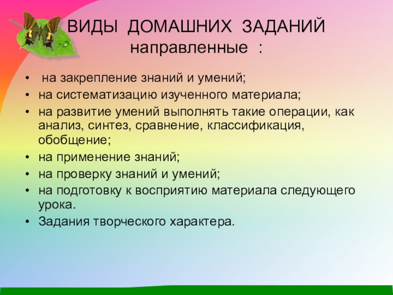 Слайд 5ВИДЫ ДОМАШНИХ ЗАДАНИЙ направленные :