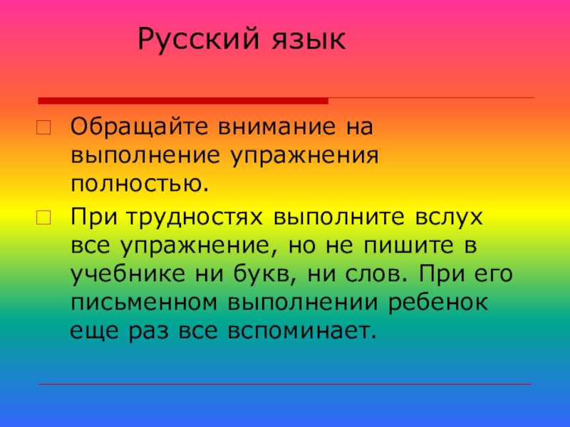 При трудностях выполните вслух все упражнение, но не пишите в учебнике ни букв, ни слов. При его письменном выполнении ребенок еще раз все вспоминает.
