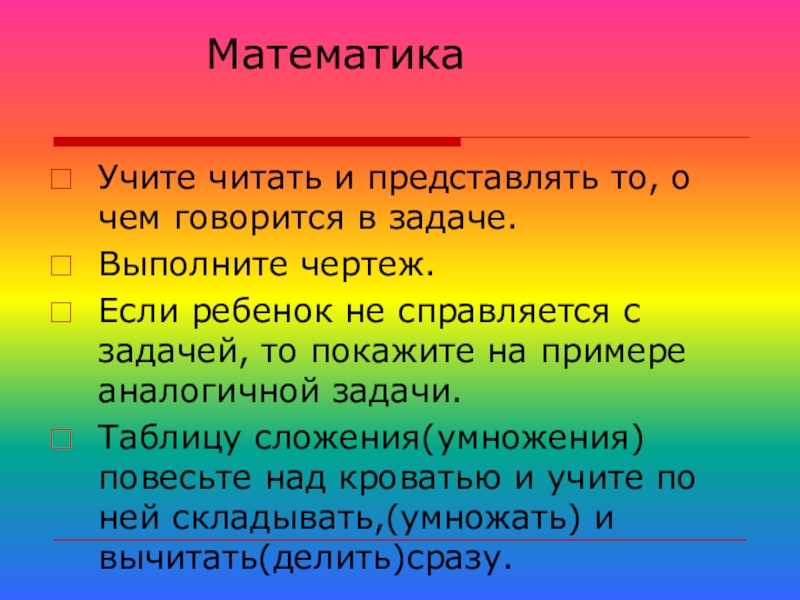 Таблицу сложения(умножения) повесьте над кроватью и учите по ней складывать,(умножать) и вычитать(делить)сразу.
