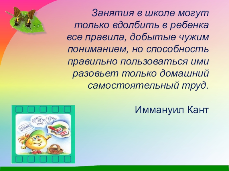 Слайд 3Занятия в школе могут только вдолбить в ребенка все правила, добытые