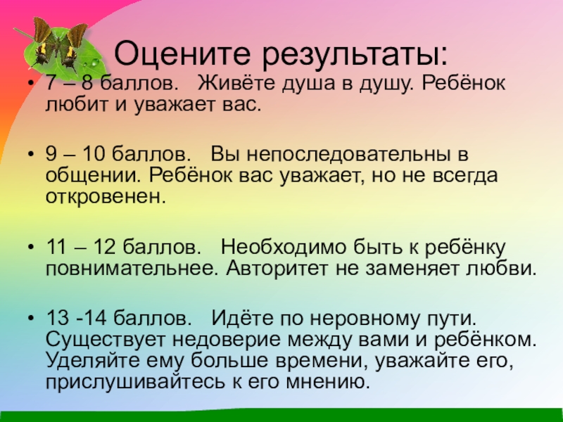 9 – 10 баллов. Вы непоследовательны в общении. Ребёнок вас уважает, но не всегда откровенен.