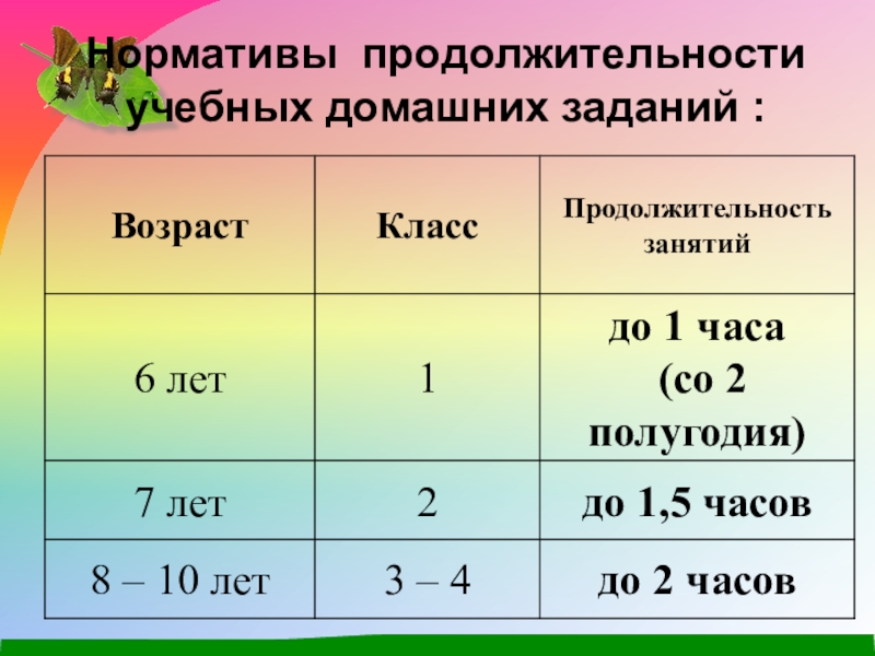 Слайд 6Нормативы продолжительности учебных домашних заданий :