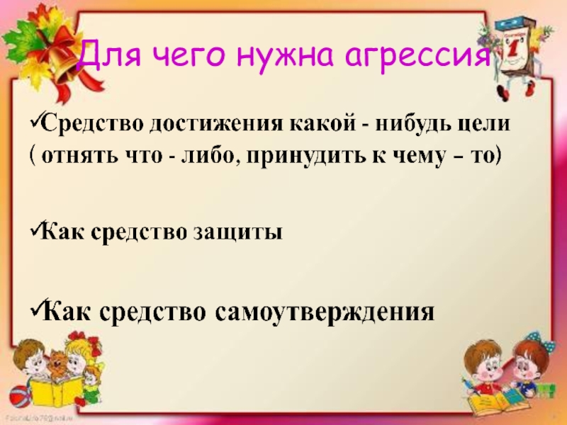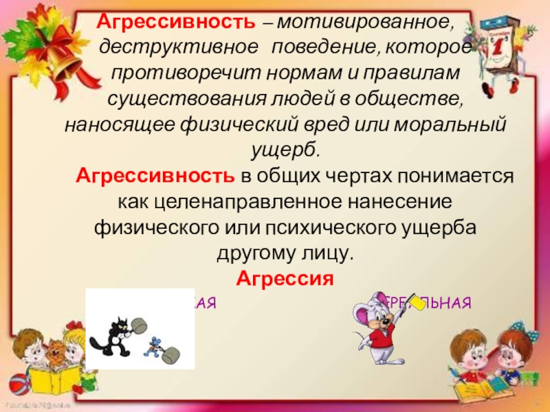 Слайд 4Агрессивность – мотивированное, деструктивное поведение, которое противоречит нормам и правилам