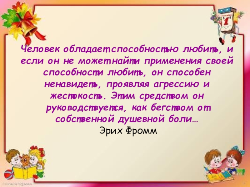 Человек обладает способностью любить, и если он не может найти применения своей способности любить, он способен ненавидеть, проявляя агрессию и жестокость. Этим средством он руководствуется, как бегством от собственной душевной боли… Эрих Фромм