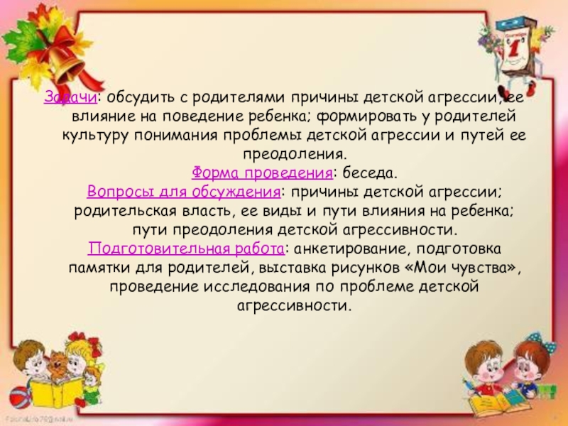 Задачи: обсудить с родителями причины детской агрессии, ее влияние на поведение ребенка; формировать у родителей культуру понимания