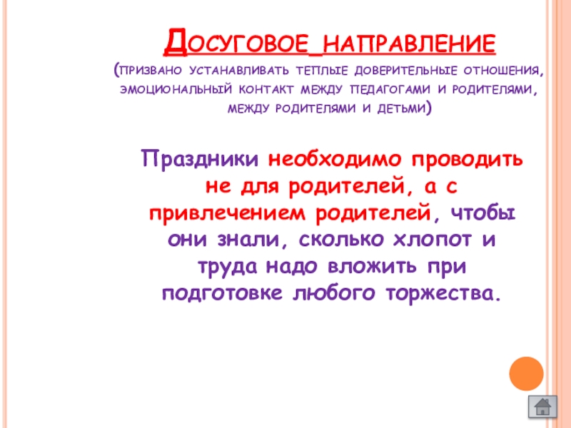 Праздники необходимо проводить не для родителей, а с привлечением родителей, чтобы они знали, сколько хлопот и труда надо вложить при подготовке любого торжества.