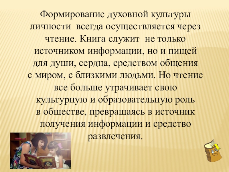 Слайд 9Формирование духовной культуры личности всегда осуществляется через чтение. Книга служит не только