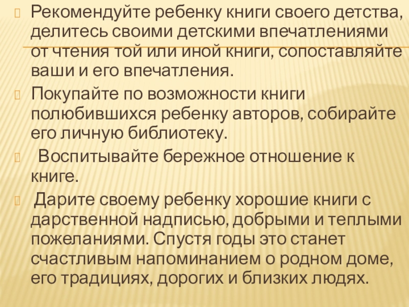 Слайд 24Рекомендуйте ребенку книги своего детства, делитесь своими детскими впечатлениями от чтения