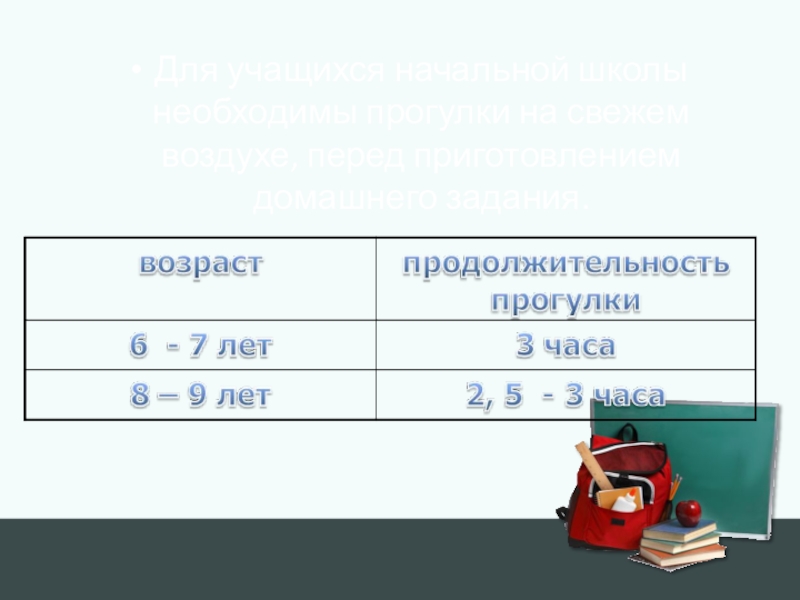 Слайд 10Для учащихся начальной школы необходимы прогулки на свежем воздухе, перед приготовлением
