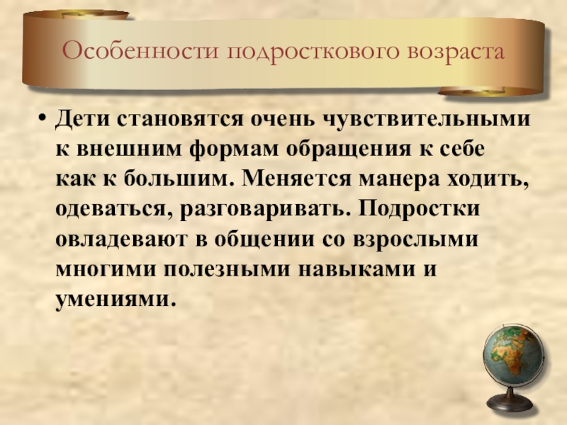 себе как к большим. Меняется манера ходить, одеваться, разговаривать. Подростки овладевают в общении со взрослыми многими полезными навыками и умениями.