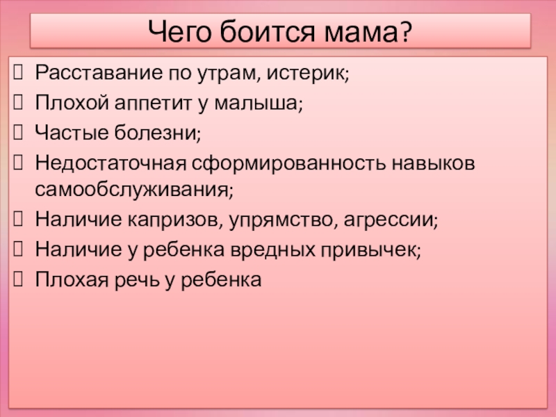 Не позволяйте ребенку манипулировать Вами и вынуждать Вас из-за слез и капризов забирать его домой. Ваше спокойствие, доброжелательное отношение поможет ребенку обрести спокойствие.