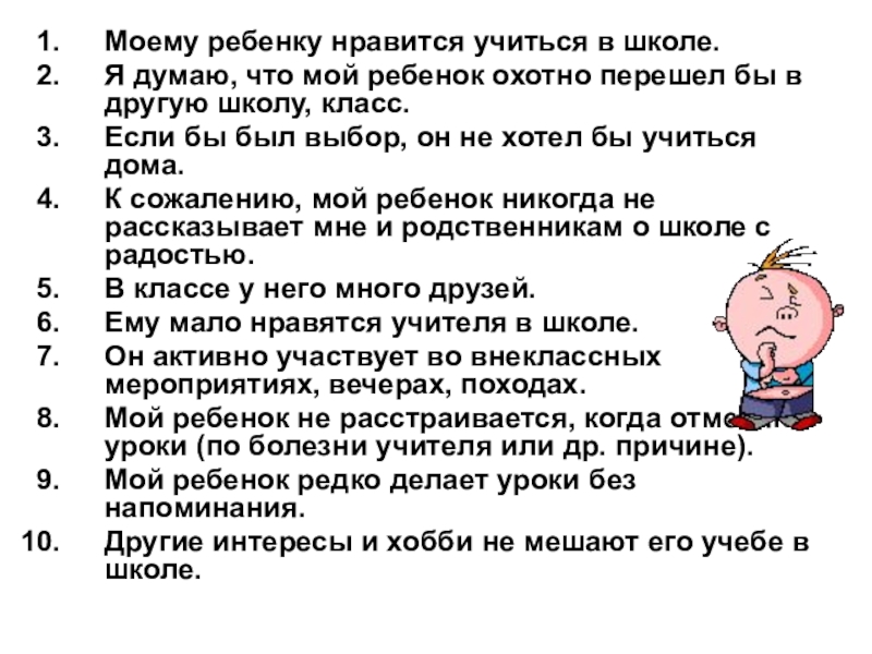 8-10 баллов - У вашего ребенка хорошее отношение к школе и скорее всего у него в ближайшее время не возникнет проблем.