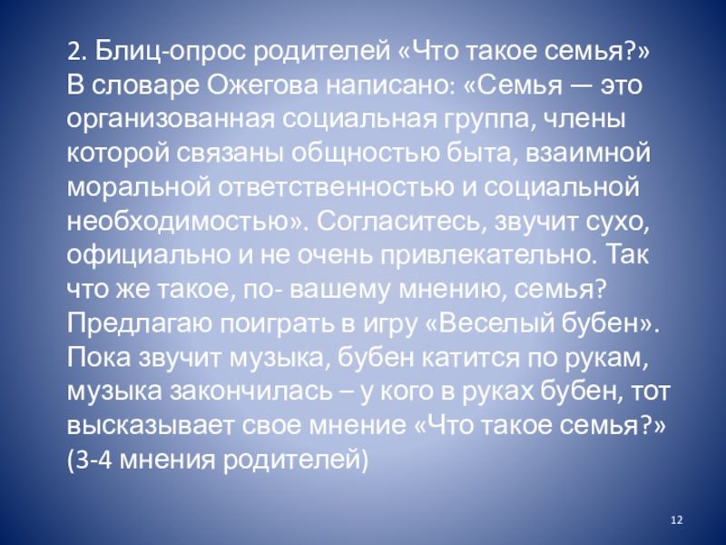 Слайд 122. Блиц-опрос родителей «Что такое семья?»