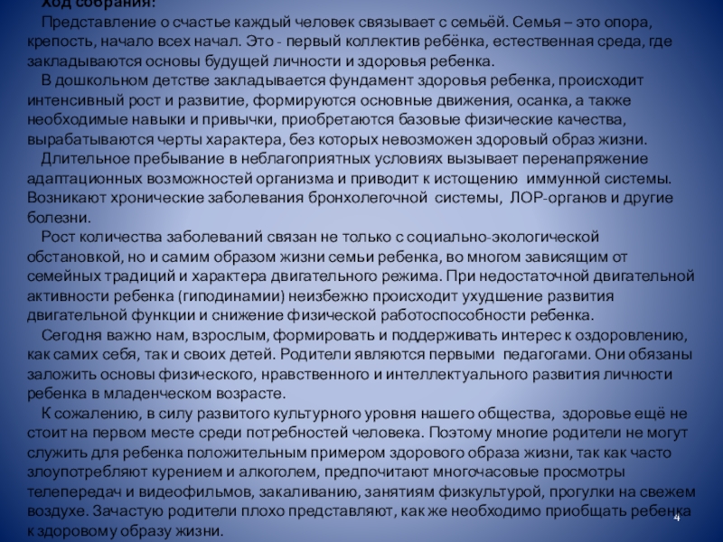 К сожалению, в силу развитого культурного уровня нашего общества, здоровье ещё не стоит на первом месте среди потребностей человека. Поэтому многие родители не могут служить для ребенка положительным примером здорового образа жизни, так как часто злоупотребляют курением и алкоголем, предпочитают многочасовые просмотры телепередач и видеофильмов, закаливанию, занятиям физкультурой, прогулки на свежем воздухе. Зачастую родители плохо представляют, как же необходимо приобщать ребенка к здоровому образу жизни.