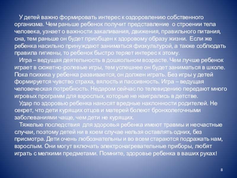 Слайд 8У детей важно формировать интерес к оздоровлению собственного организма. Чем раньше