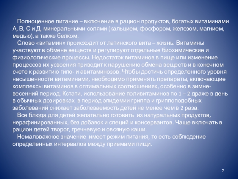 Слайд 7Полноценное питание – включение в рацион продуктов, богатых витаминами А, В,