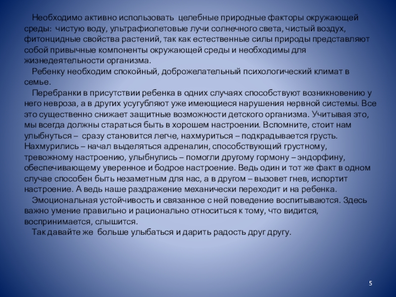 Слайд 5Необходимо активно использовать целебные природные факторы окружающей среды: чистую воду, ультрафиолетовые