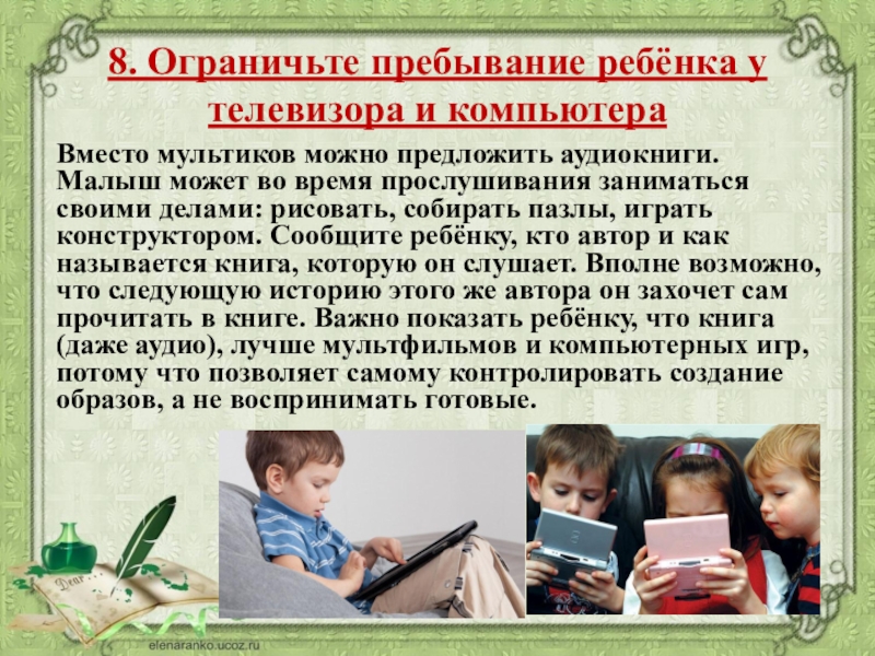 Слайд 158. Ограничьте пребывание ребёнка у телевизора и компьютера
