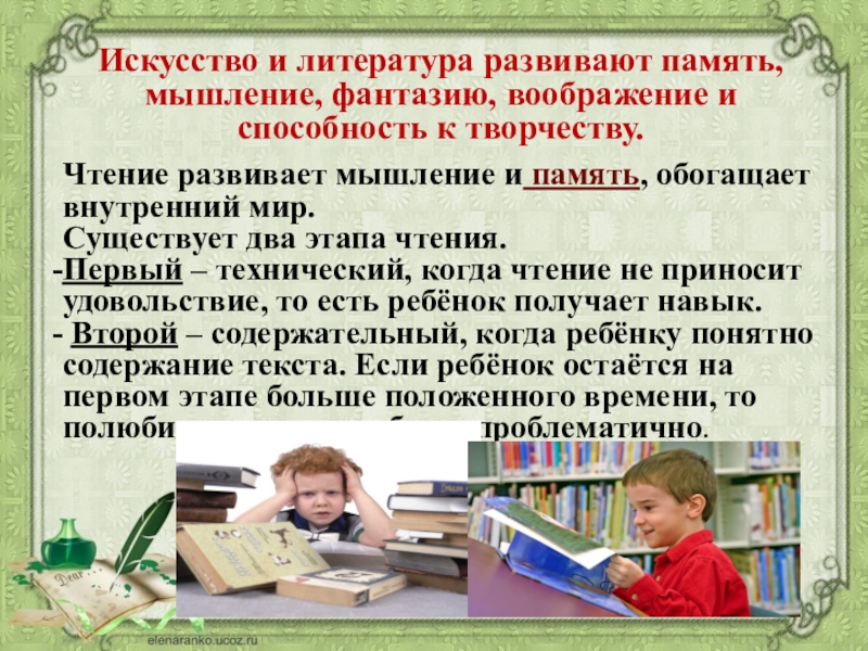 Слайд 4Искусство и литература развивают память, мышление, фантазию, воображение и способность к