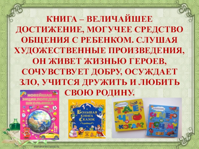 Слайд 6КНИГА – ВЕЛИЧАЙШЕЕ ДОСТИЖЕНИЕ, МОГУЧЕЕ СРЕДСТВО ОБЩЕНИЯ С РЕБЕНКОМ. СЛУШАЯ ХУДОЖЕСТВЕННЫЕ