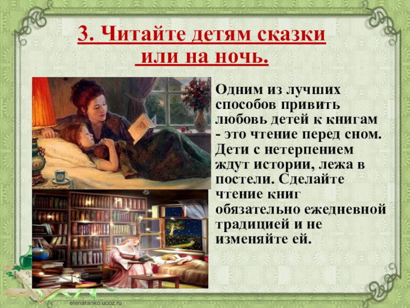 любовь детей к книгам - это чтение перед сном. Дети с нетерпением ждут истории, лежа в постели. Сделайте чтение книг обязательно ежедневной традицией и не изменяйте ей.