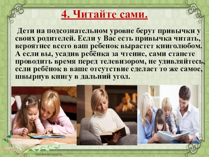 Если у Вас есть привычка читать, вероятнее всего ваш ребенок вырастет книголюбом. А если вы, усадив ребёнка за чтение, сами станете проводить время перед телевизором, не удивляйтесь, если ребёнок в ваше отсутствие сделает то же самое, швырнув книгу в дальний угол.