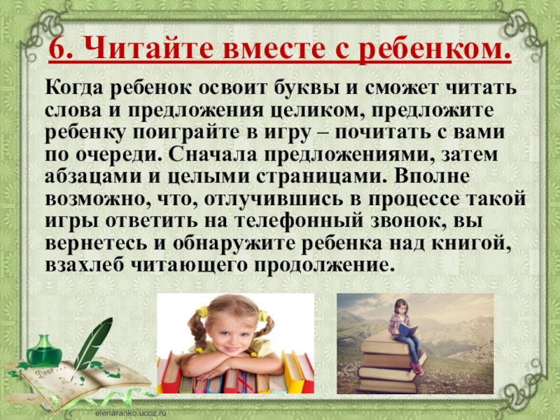 слова и предложения целиком, предложите ребенку поиграйте в игру – почитать с вами по очереди. Сначала предложениями, затем абзацами и целыми страницами. Вполне возможно, что, отлучившись в процессе такой игры ответить на телефонный звонок, вы вернетесь и обнаружите ребенка над книгой, взахлеб читающего продолжение.