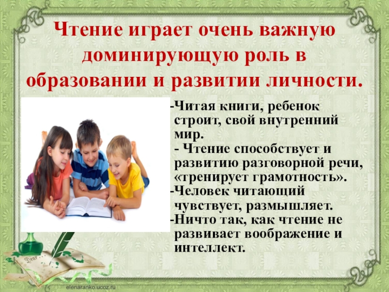 Слайд 3Чтение играет очень важную доминирующую роль в образовании и развитии личности.