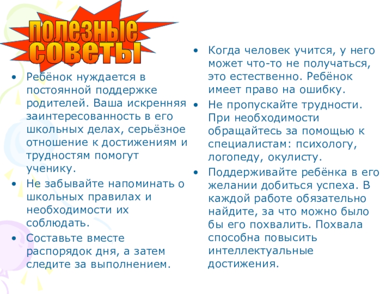 Поддерживайте ребёнка в его желании добиться успеха. В каждой работе обязательно найдите, за что можно было бы его похвалить. Похвала способна повысить интеллектуальные достижения.