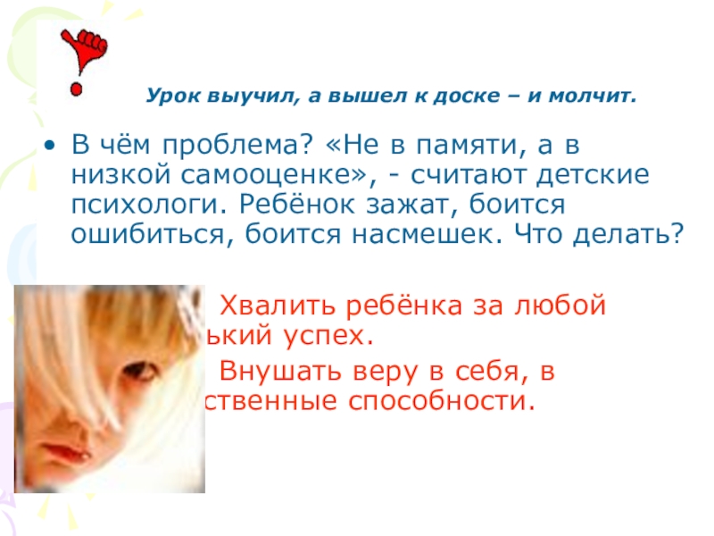 В чём проблема? «Не в памяти, а в низкой самооценке», - считают детские психологи. Ребёнок зажат, боится ошибиться, боится насмешек. Что делать?