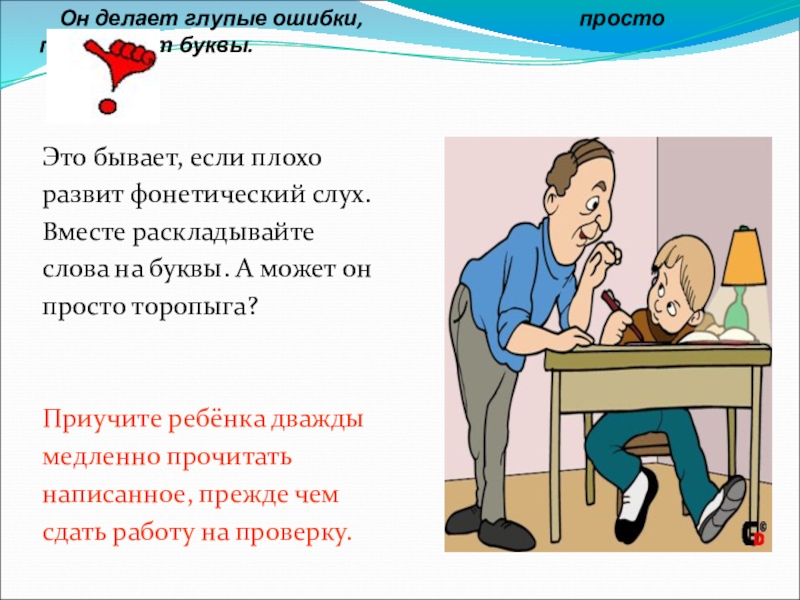 Не пропускайте трудности. При необходимости обращайтесь за помощью к специалистам: психологу, логопеду, окулисту.