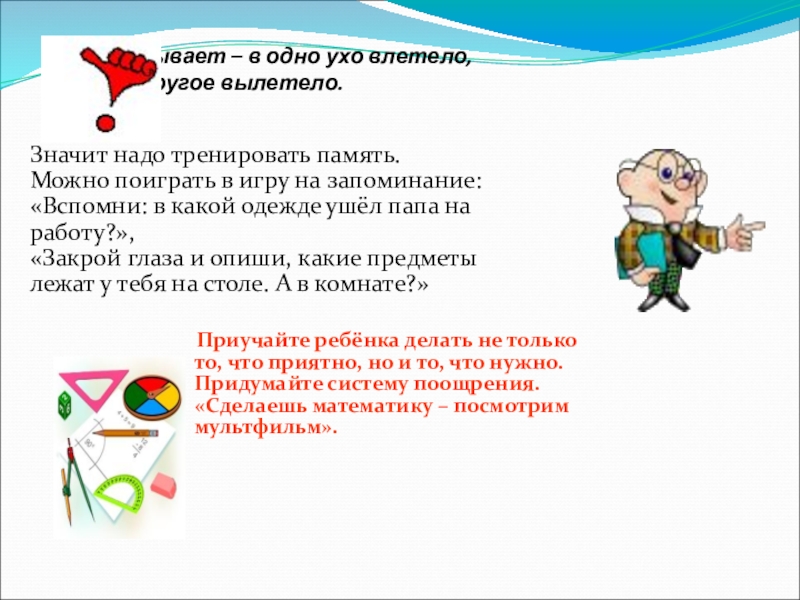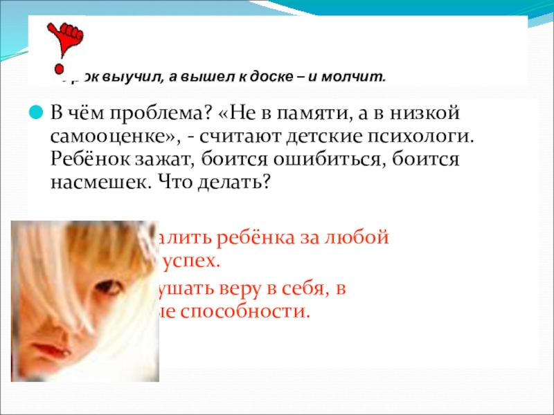В чём проблема? «Не в памяти, а в низкой самооценке», - считают детские психологи. Ребёнок зажат, боится ошибиться, боится насмешек. Что делать?