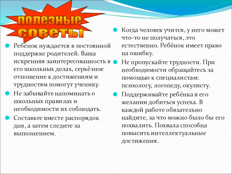 Поддерживайте ребёнка в его желании добиться успеха. В каждой работе обязательно найдите, за что можно было бы его похвалить. Похвала способна повысить интеллектуальные достижения.