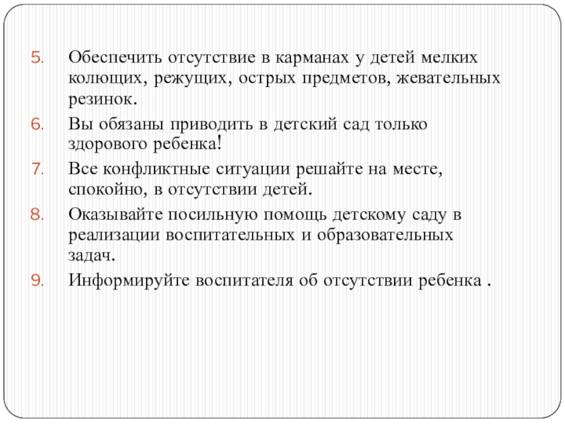 Слайд 32Обеспечить отсутствие в карманах у детей мелких колющих, режущих, острых предметов,