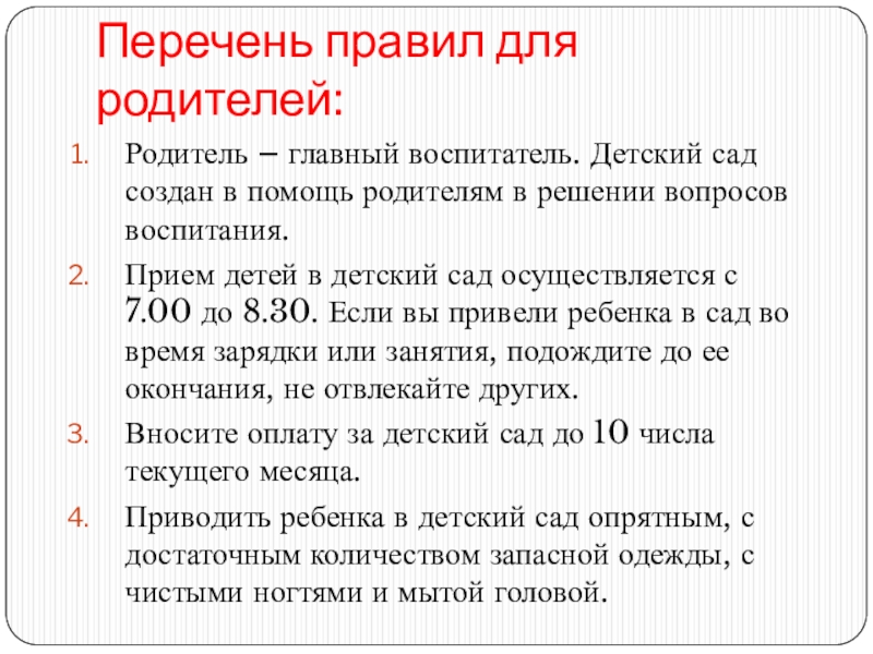 Слайд 31Перечень правил для родителей:
