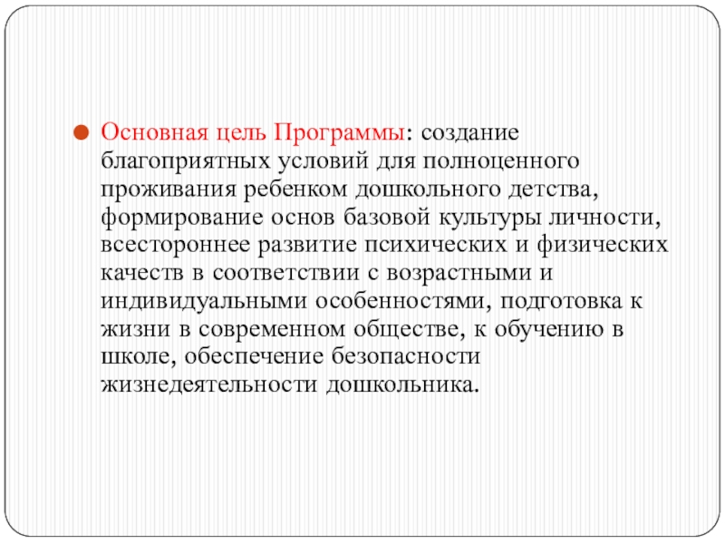Слайд 16Основная цель Программы: создание благоприятных условий для полноценного проживания ребенком дошкольного