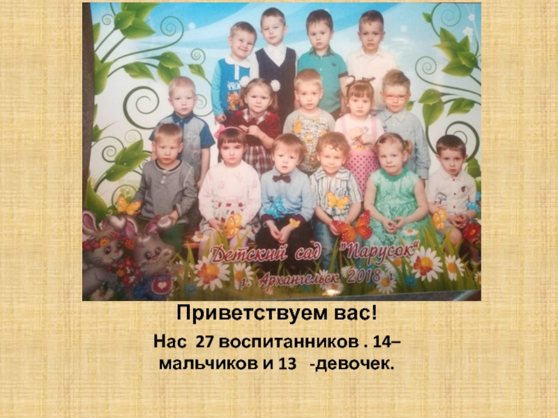 Приветствуем вас!Нас 27 воспитанников . 14– мальчиков и 13  -девочек.