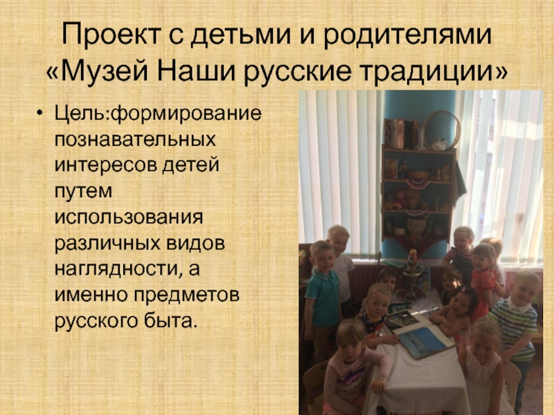 Проект с детьми и родителями «Музей Наши русские традиции»Цель:формирование познавательных интересов детей путем использования различных видов наглядности,