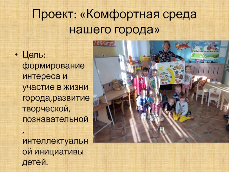 Проект: «Комфортная среда нашего города»Цель:формирование интереса и участие в жизни города,развитие творческой, познавательной,интеллектуальной инициативы детей.