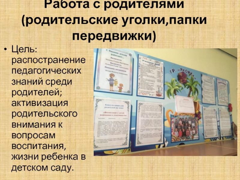 Слайд 21Работа с родителями (родительские уголки,папки передвижки)