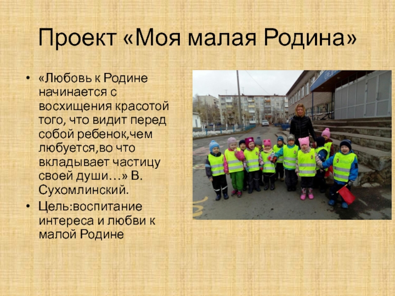 Проект «Моя малая Родина»«Любовь к Родине начинается с восхищения красотой того, что видит перед собой ребенок,чем любуется,во