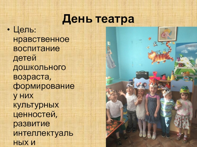 День театраЦель:нравственное воспитание детей дошкольного возраста, формирование у них культурных ценностей, развитие интеллектуальных и личностных качеств детей.