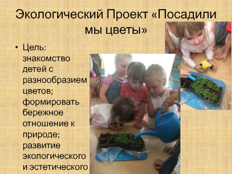 Экологический Проект «Посадили мы цветы»Цель:знакомство детей с разнообразием цветов;формировать бережное отношение к природе;развитие экологического и эстетического воспитания