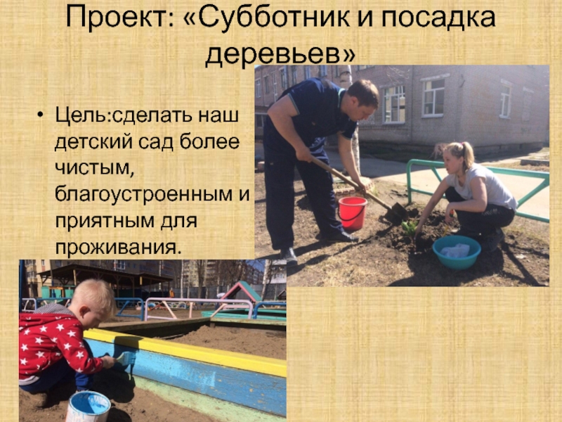 Проект: «Субботник и посадка деревьев» Цель:сделать наш детский сад более чистым, благоустроенным и приятным для проживания.