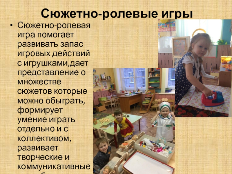 Сюжетно-ролевые игрыСюжетно-ролевая игра помогает развивать запас игровых действий с игрушками,дает представление о множестве сюжетов которые можно обыграть,
