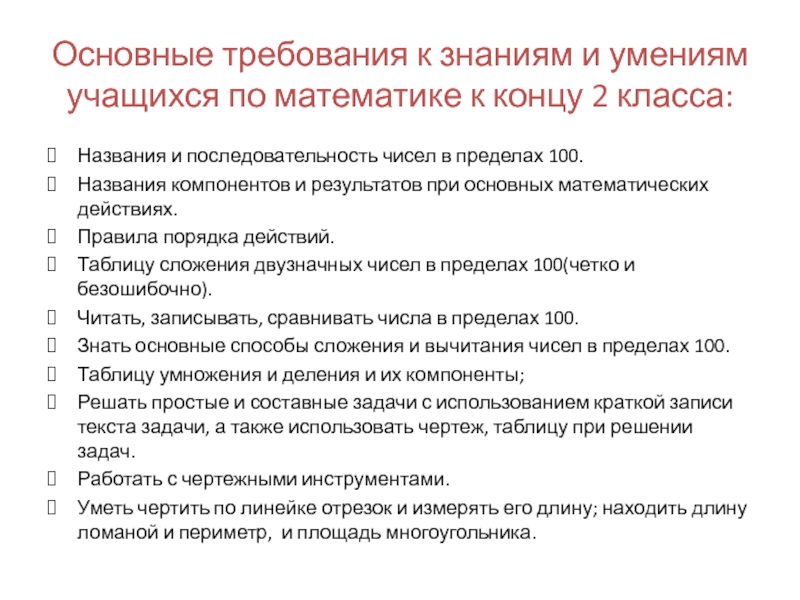 Уметь чертить по линейке отрезок и измерять его длину; находить длину ломаной и периметр, и площадь многоугольника.