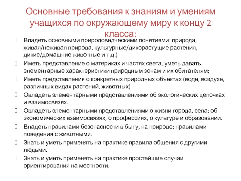 Владеть основными природоведческими понятиями: природа, живая/неживая природа, культурные/дикорастущие растения, дикие/домашние животные и т.д.)