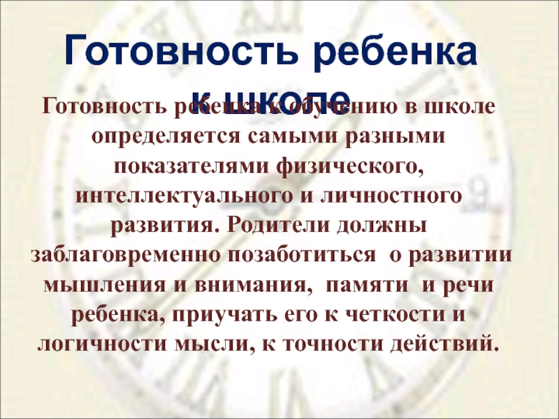 разными показателями физического, интеллектуального и личностного развития. Родители должны заблаговременно позаботиться о развитии мышления и внимания, памяти и речи ребенка, приучать его к четкости и логичности мысли, к точности действий.